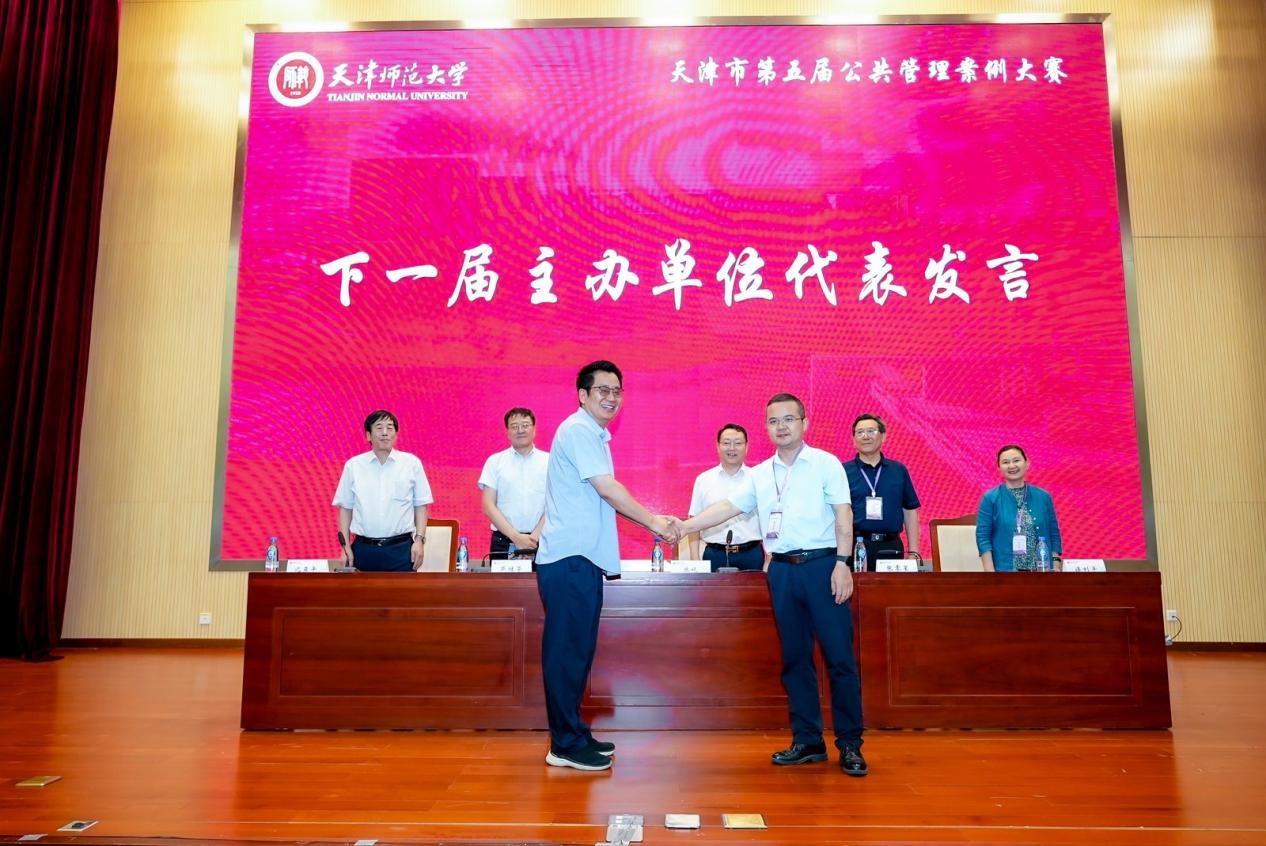 最后,天津市公共管理案例大賽進行了舉辦單位交接儀式,天津市第六屆公共管理案例大賽主辦單位代表、河北工業大學人文與法律學院副院長閆文博發言,他對本屆大賽的圓滿舉辦表示祝賀,并介紹了下一屆賽事的籌備設想,歡迎各高校師生繼續關注與參與,共同推動公共管理案例教育教學活動的深入開展。