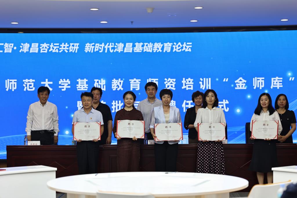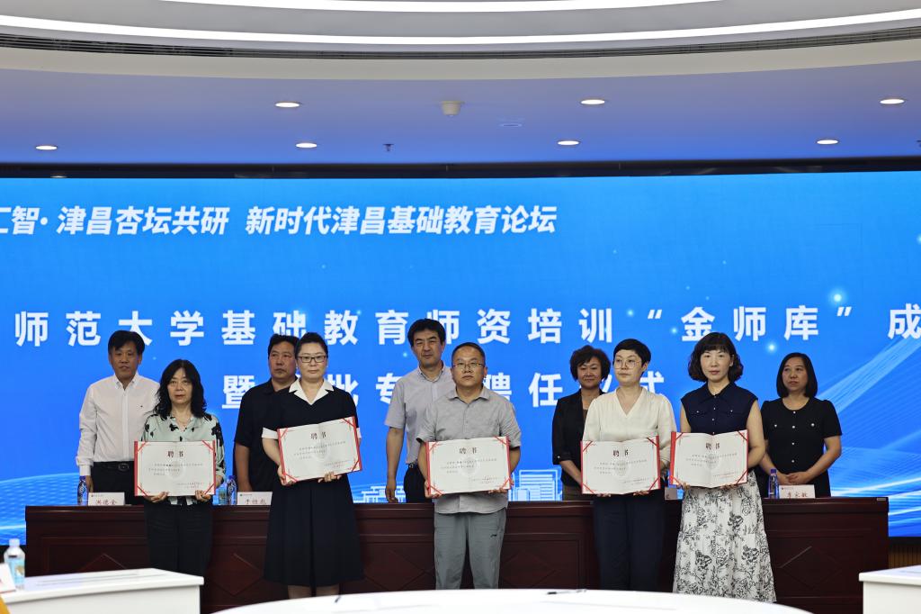 論壇期間,天津師范大學基礎教育師資培訓“金師庫”成立。與會領導為在場的首批10位專家頒發聘任證書。“金師庫”匯聚了國內基礎教育領域的知名教授、學者與一線名師名校長。他們將依托深厚的理論積淀與豐富的實踐經驗,為師資培訓提供科學系統的指導,量身定制更具針對性與實效性的培訓方案,助力打造師德高尚、業務精湛、充滿活力的高素質專業化教師隊伍。