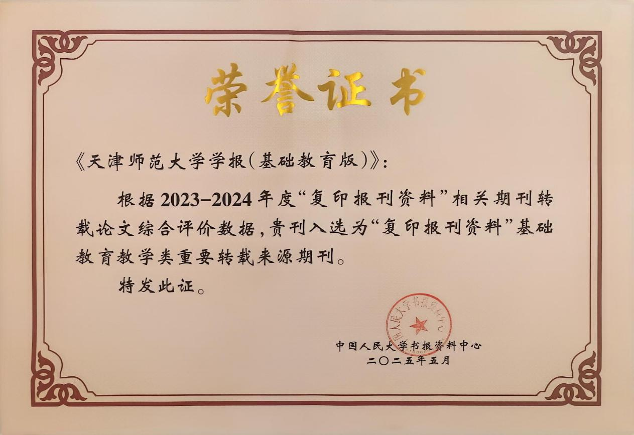 《天津師范大學學報(基礎教育版)》入選人大復印報刊資料基礎教育教學類重要轉載來源期刊,這是我刊第四次獲此殊榮。此次入選,是對《天津師范大學學報(基礎教育版)》辦刊成績的肯定,也是對我們未來發展的重要激勵。編輯部將繼續發揮學術引領作用,不斷提升辦刊質量,為辦好基礎教育領域的一本好刊而努力。