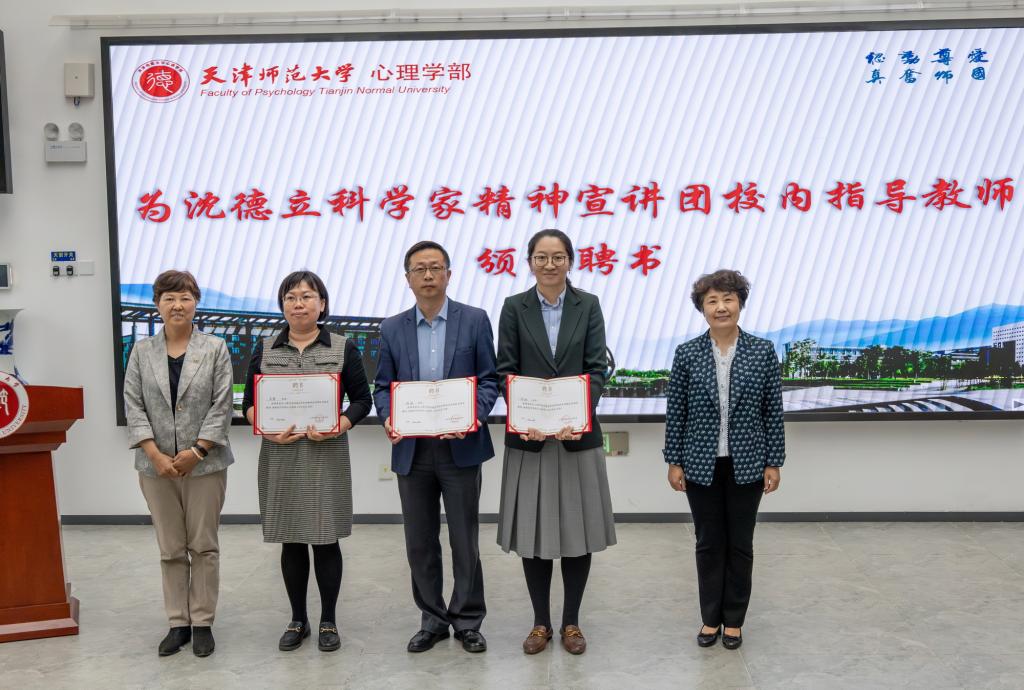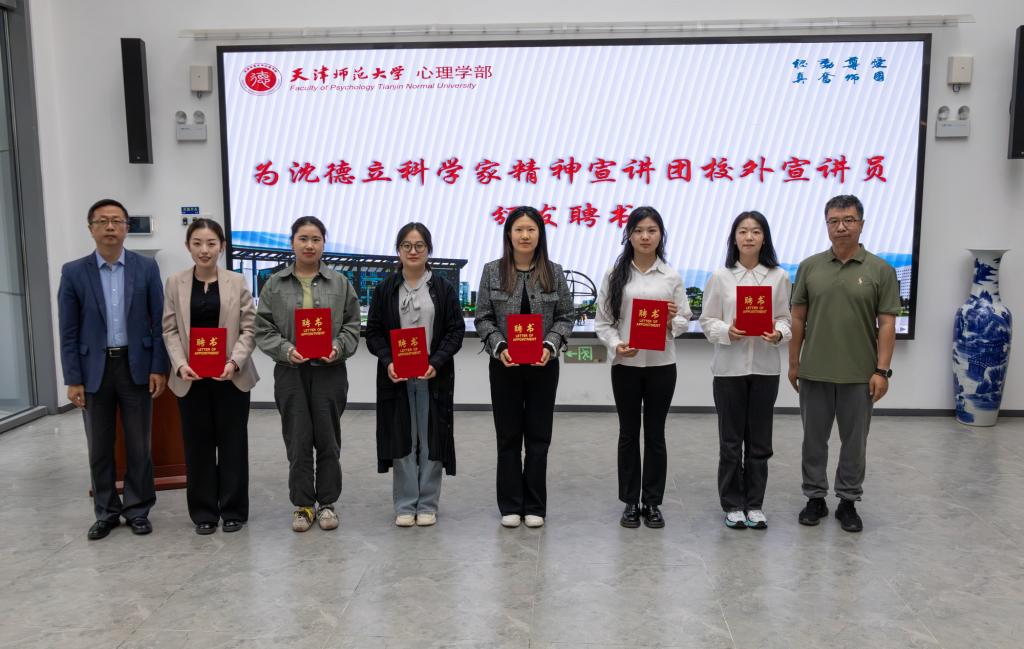 與會領(lǐng)導(dǎo)為沈德立科學(xué)家精神宣講團(tuán)成員代表頒發(fā)聘書、佩戴綬帶。學(xué)部校友、南開中學(xué)穆玉鳳、天津一中王亞麗、耀華中學(xué)張紅肖、新華中學(xué)許岳寧、實(shí)驗(yàn)中學(xué)郭雯、天津師范大學(xué)附屬實(shí)驗(yàn)學(xué)校孫銘悅受聘為校外宣講員,校友服務(wù)與管理中心主任楊琥、天津市學(xué)生心理健康教育發(fā)展中心副主任李馨、全國高校“雙帶頭人”教師黨支部書記“強(qiáng)國行”專項(xiàng)行動團(tuán)隊(duì)成員林琳受聘為宣講團(tuán)校內(nèi)指導(dǎo)教師。
