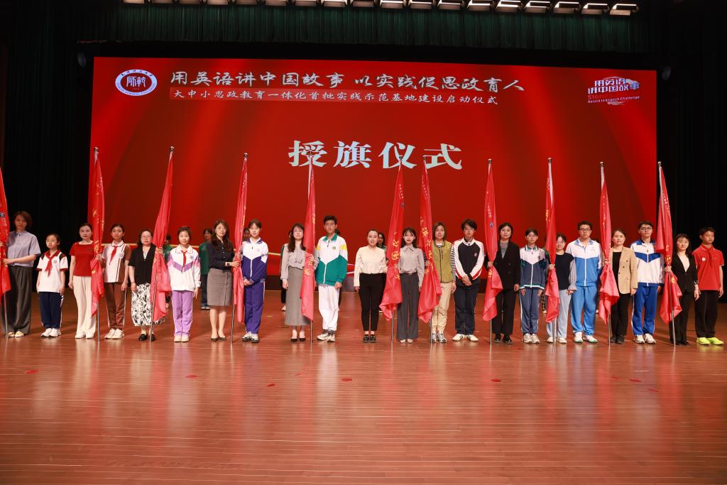 儀式現(xiàn)場(chǎng),張凡林代表中國(guó)國(guó)家創(chuàng)新與發(fā)展戰(zhàn)略研究會(huì)中國(guó)故事研究院為天津師范大學(xué)外國(guó)語(yǔ)學(xué)院和新航道天津?qū)W校授牌,共建“用英語(yǔ)講中國(guó)故事教育實(shí)踐基地”。隨后,與會(huì)領(lǐng)導(dǎo)為天津市實(shí)驗(yàn)中學(xué)、天津市第二中學(xué)、天津市和平區(qū)昆明路小學(xué)等10所中小學(xué)頒發(fā)“用英語(yǔ)講中國(guó)故事大中小思政教育一體化首批實(shí)踐示范基地”牌匾和“用英語(yǔ)講中國(guó)故事宣講團(tuán)”旗幟,這也標(biāo)志著大中小學(xué)將打破學(xué)段壁壘,形成育人矩陣,以英語(yǔ)為橋梁,在跨學(xué)段貫通中厚植家國(guó)情懷,培養(yǎng)具有國(guó)際視野的新時(shí)代人才。