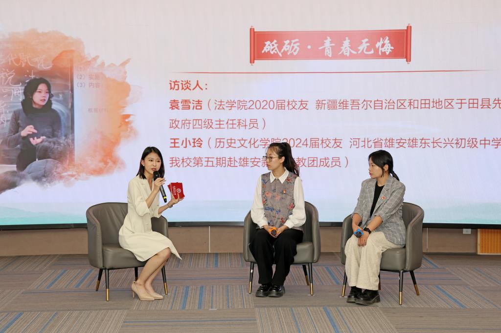 訪談環(huán)節(jié)中,“樹人學(xué)坊”專任教師教學(xué)能力提升研修班教師“師徒”代表,生命科學(xué)學(xué)院教授楊琳和生命科學(xué)學(xué)院青年教師楊紅宇講述自樹樹人、薪火相傳的故事,重溫從教初心、堅(jiān)定教育信仰,矢志以教育家精神為引領(lǐng),用行動(dòng)傳承和踐行教書育人使命。法學(xué)院2020屆校友、新疆維吾爾自治區(qū)和田地區(qū)于田縣先拜巴扎鎮(zhèn)政府四級(jí)主任科員袁雪潔,歷史文化學(xué)院2024屆校友、河北省雄安雄東長興初級(jí)中學(xué)歷史教師、我校第五期赴雄安新區(qū)支教團(tuán)成員王小玲與師生分享了扎根祖國邊疆、投身基層一線,將個(gè)人理想融入時(shí)代洪流的青春故事,以生動(dòng)實(shí)踐在祖國最需要的地方譜寫青春篇章。鮮活的事例、樸素的語言、真摯的情感,引發(fā)現(xiàn)場(chǎng)觀眾強(qiáng)烈的思想共鳴,贏得陣陣掌聲。