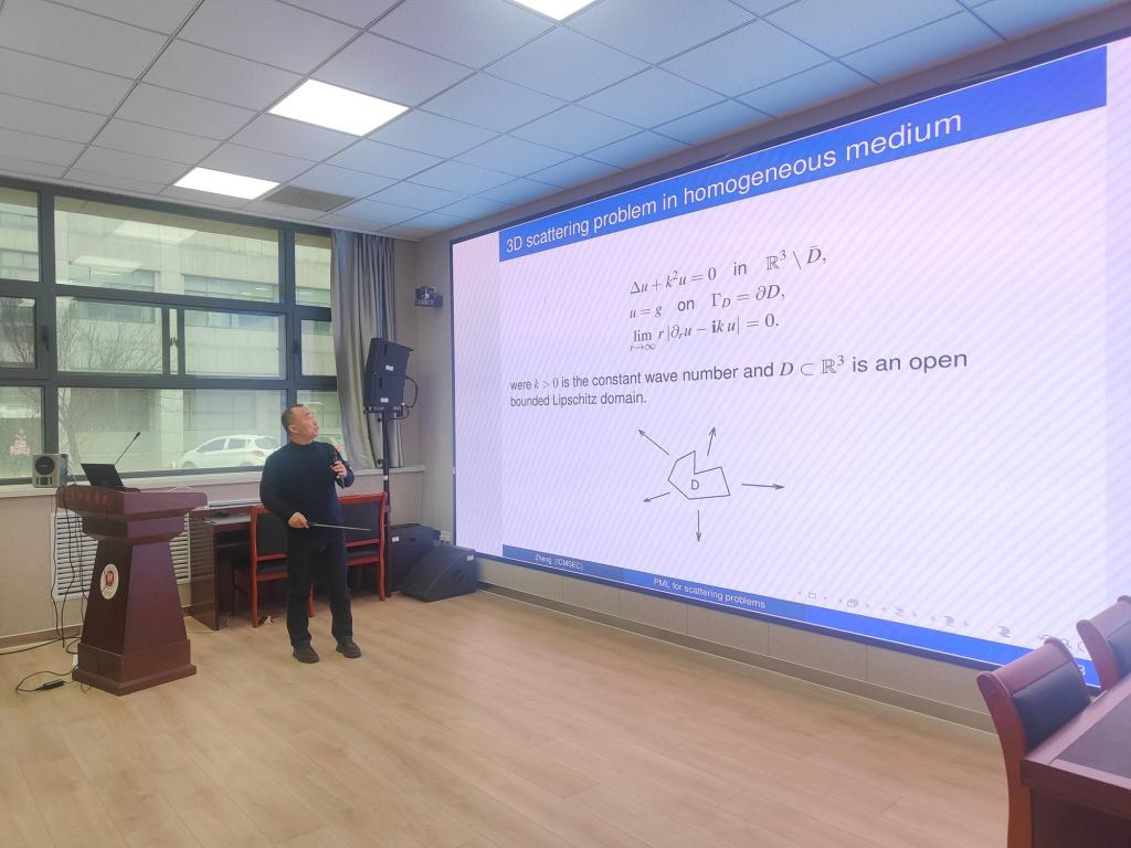 報告會上,鄭偉英以“Stability and convergence of PML methods for wave scattering problems”題為,系統(tǒng)闡述了散射問題中完美匹配層(PML)方法的最新研究進展,詳細講解了如何通過完美匹配層技術(shù)將無界域散射問題轉(zhuǎn)化為有界域問題的數(shù)學(xué)原理。他介紹了圓形PML方法在穩(wěn)定性和收斂性方面的理論證明,進一步拓展到雙層介質(zhì)散射問題和階梯狀表面散射問題的PML方法研究,展示了該方法在復(fù)雜場景中的應(yīng)用潛力。
