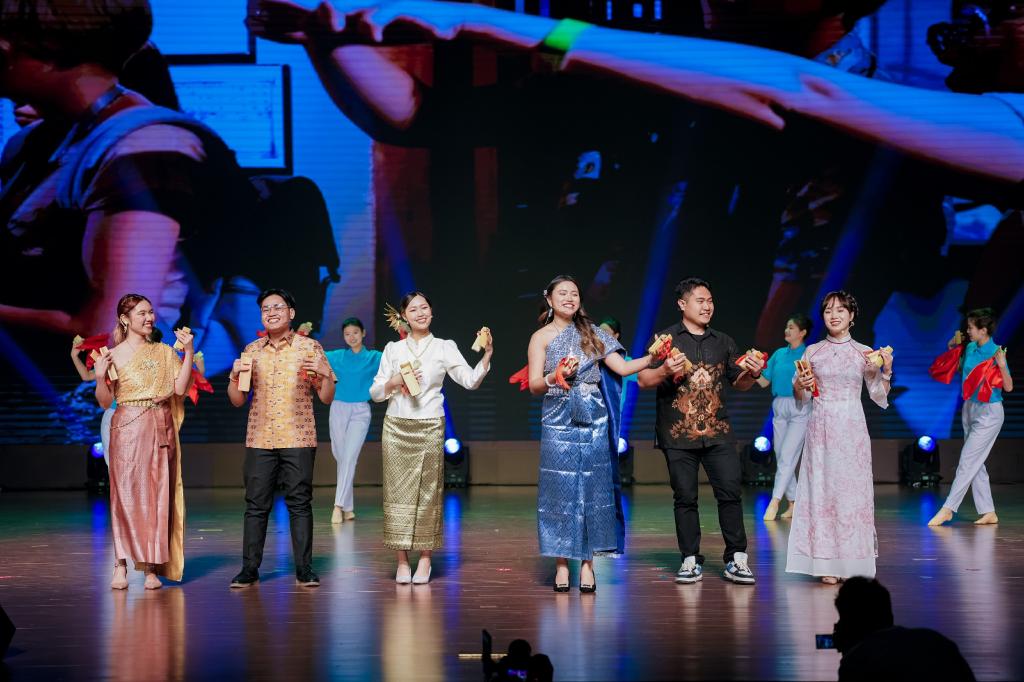 與會嘉賓共同觀看京津冀學(xué)生展演作品,展演在彰顯東盟風(fēng)情的民族舞蹈串燒《多姿》中拉開序幕,原創(chuàng)音樂快板作品《“我與中國”情意長》展現(xiàn)東盟學(xué)子中文水平和精湛才藝的同時,流露出一種深厚的情懷和熱愛;海外組織方以及選手采訪VCR“中文改變了我”中選手們的真情流露感人至深,詮釋了“語言是文化交流鑰匙”的真正含義;北京高校展演作品《你好北外——青春之舞》在講述青春風(fēng)采和中國故事的同時,點燃了青春躍動、共赴新程的理想火焰;舞臺劇《穿越奇遇》完美演繹了古代與現(xiàn)代因文化傳承創(chuàng)新發(fā)展而碰撞出的別樣火花;河北省高校選送節(jié)目《詩經(jīng)東南風(fēng)》中,東盟青年用東南亞歌曲唱誦詩經(jīng),播撒語言互通、理解互信、文明互鑒的種子;在“我與中國”非遺市集游園會中,天津高校東盟學(xué)生選手將文化市集搬到舞臺,為現(xiàn)場觀眾送上新穎獨特的文化創(chuàng)意和實踐體驗;AI創(chuàng)意對話展示《魅力中文》在展示科學(xué)創(chuàng)新發(fā)展的同時,抒發(fā)了希望科技之光引領(lǐng)國際中文教育走向更美好未來的愿望。
