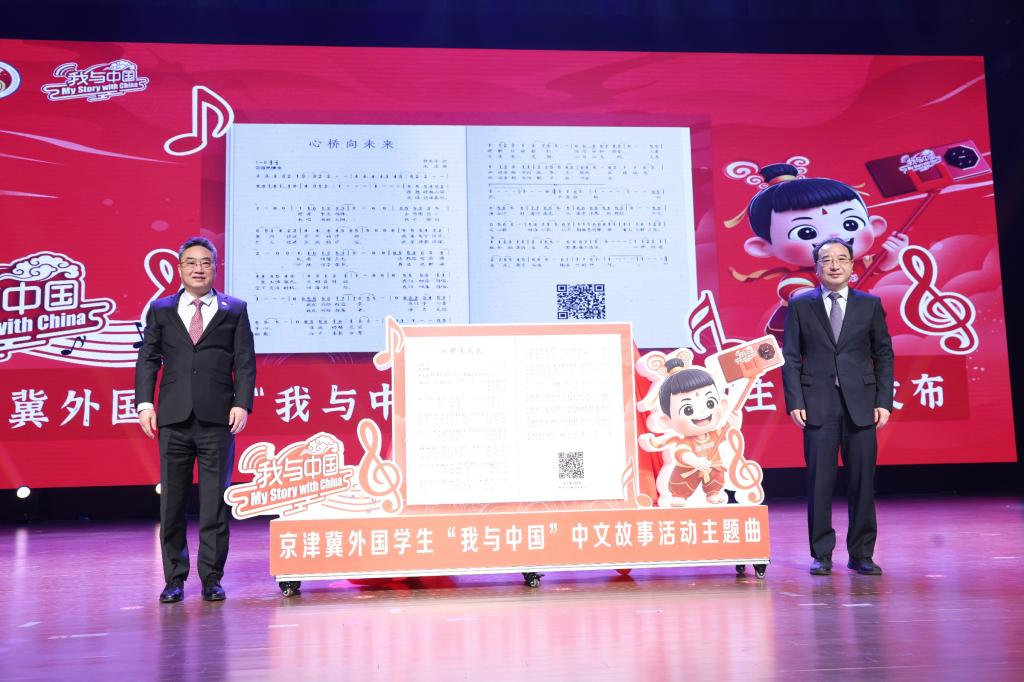活動現(xiàn)場,史忠俊和天津師范大學(xué)黨委書記曲凱共同為京津冀外國學(xué)生“我與中國”中文故事活動主題曲《心橋向未來》發(fā)布揭幕。