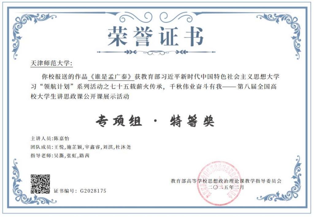 本站訊(通訊員 金明昊)近日,第八屆全國高校大學生講思政課公開課展示活動獲獎名單公布。由馬克思主義學院教師吳澌,教育學部教師張虹、路茜指導的陳嘉怡團隊(團隊成員:王悅、施芷穎、宰鑫睿、劉淇、杜沐堯)的參賽作品《誰是孟廣泰》,在全國1339所高校提交的5007部參賽作品中脫穎而出,斬獲特等獎。