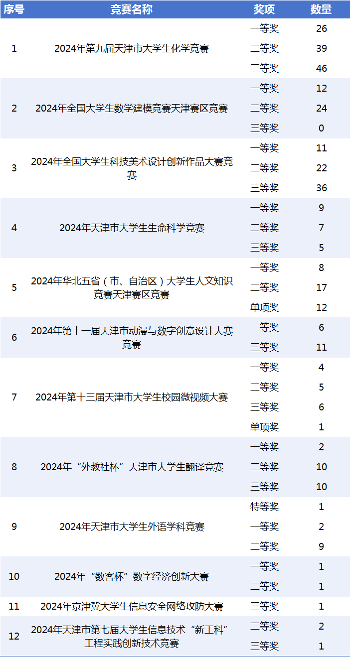 本站訊(通訊員 李倩 周藝璇)近日,天津市教委公布了2024年下半年全國大學生科技美術設計創新作品大賽等15項賽事的獲獎名單。我校學子奮勇爭先,成績斐然,在2024年第九屆天津市大學生化學競賽、2024年全國大學生數學建模競賽天津賽區競賽、2024年華北五省(市、自治區)大學生人文知識競賽天津賽區競賽等多項高水平賽事中表現突出,累計斬獲347項獎項,充分彰顯了我校學子扎實的專業素養和卓越的創新能力。