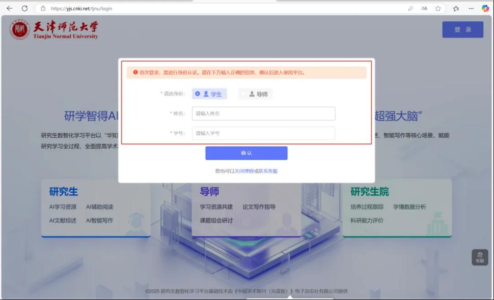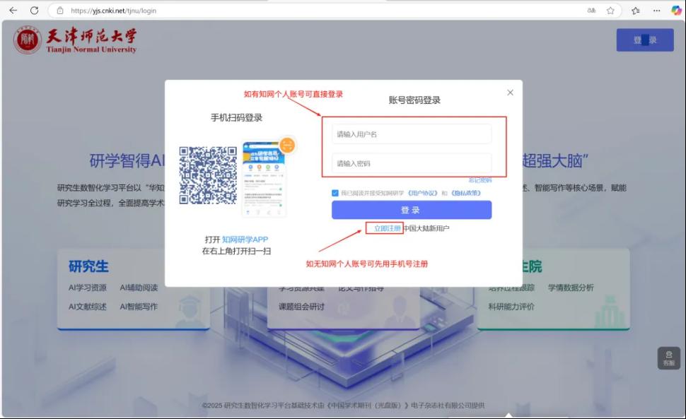 天津師范大學研究生院主頁(https://yjsy.tjnu.edu.cn/)-站點鏈接-研學智得-點擊右上角【登錄】-注冊或登錄個人賬號-選擇學生/導師身份-填寫姓名、學號/工號后進入系統-點擊左側導航欄-【研學智得AI+DeepSeek】即可進入。