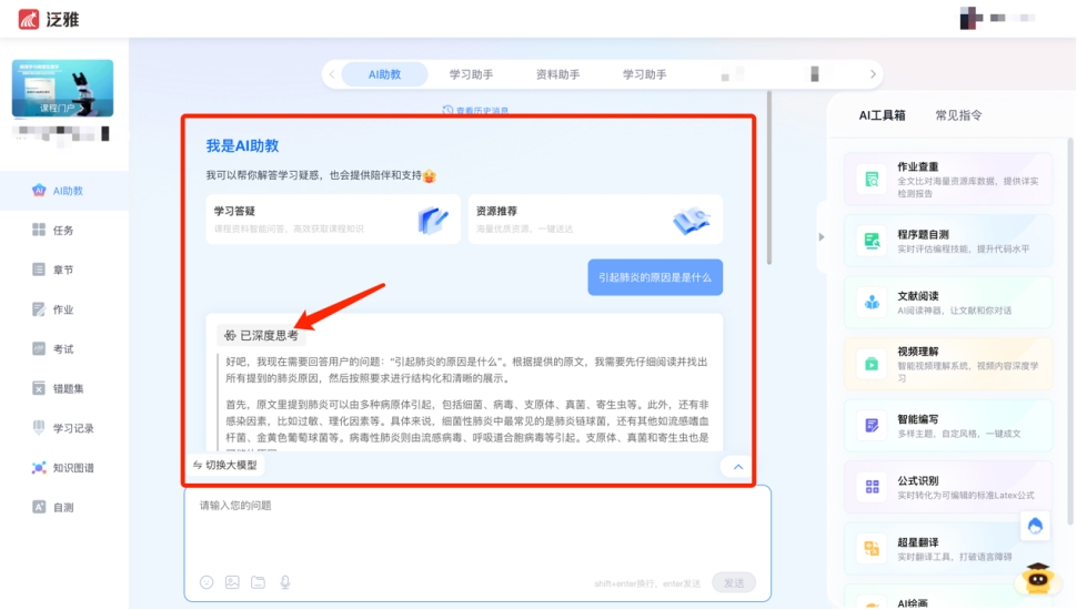 天津師范大學教務處主頁(https://jwc.tjnu.edu.cn/)-站點鏈接-爾雅通識選修課平臺-填寫學號/工號及密碼后進入。登錄個人教學空間后,點擊“課程”—“我教的課(教師)/我學的課(學生)“,選擇具體課程,進入課程主頁面,在左側工具欄,點擊AI助教,即可進行智能問答。近日功能將繼續完善,支持大模型智能切換,請大家關注。