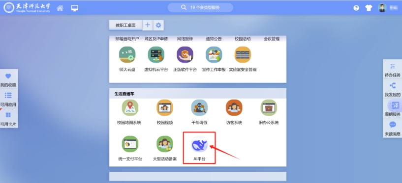 師生使用天津師范大學統一身份認證賬號登錄網上服務大廳https://ehall.tjnu.edu.cn/new/index.html,點擊“AI平臺”圖標,即可進入DeepSeek對話頁面。