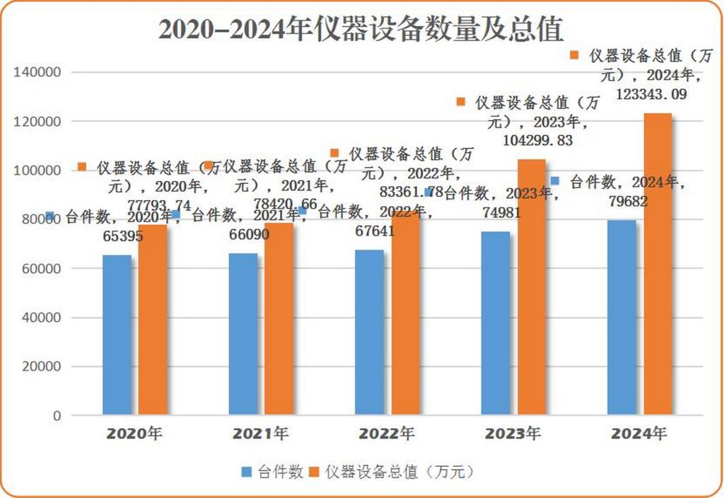 五年間,我校資產總量迅速增加,資產結構更為合理,辦學條件得到顯著改善。2020年,我校儀器設備總值為77793.74萬元,到2024年末已達到123343.09萬元,僅2022年中長期貸款采購教學科研儀器設備家具53861.10萬元,其中,貴重儀器設備248臺件,合同金額21323.85萬元。近五年儀器設備總值增長58.55%。單價10萬元以上貴重儀器設備總值由2020年的32730.68萬元增長至62363.28萬元,近五年總值增長90.53%。