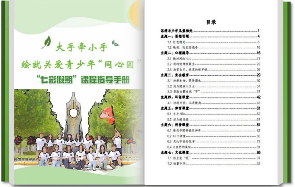 服務隊最大化發揮專業優勢,90%的隊員來自師范類專業,覆蓋學科數學、語文、思政、生物以及人工智能(師范)等多學科領域,他們緊密結合少年兒童的年齡特點和成長需求,科學設計涵蓋思政、心理、安全、環保、體育、科普、文化七大主題的課程體系并系統整合活動組織、課程設計、人員安排等內容,編撰了一本包含17節精品課程、百余頁、四萬余字的“七彩假期”指導手冊,并與社區形成協同育人共建,有效搭建起促進少年兒童全面發展的實踐課堂。
