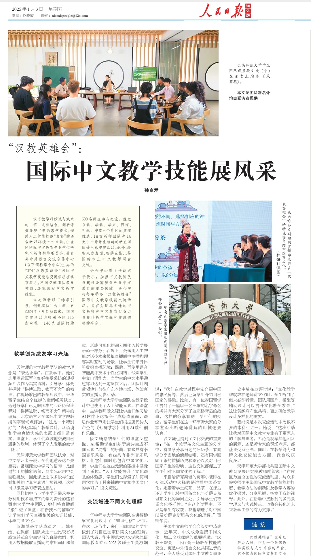 “漢教英雄會”是國際中文教育領域最具品牌影響的教學技能競技盛會。本屆“漢教英雄會”以“標準引領,創新驅動”為主題,吸引全國112所院校的146支團隊的600多名師生參賽,經過東北、華北、華東、西南、西北、中南6個片區的交流比武和全球21個國家近400名本土中文教師的競逐比拼,我校師生團隊分別獲得2024“漢教英雄會”華北區“最佳教學設計團隊”“最佳教學組織團隊”及全國僅18支團隊獲獎的“最佳教學組織團隊”及全國“最佳教學組織獎”和“最佳教師風采獎”。師生團隊還受到人民日報海外版采訪報道。