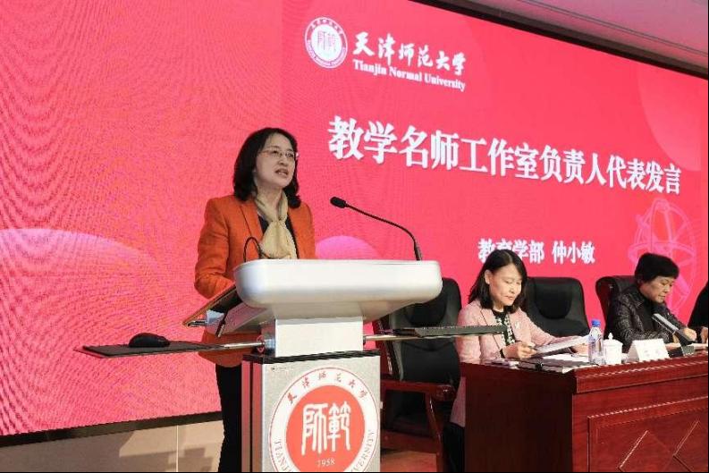 會上為首批教學名師工作室負責人授牌,教學名師工作室負責人代表仲小敏發言。她表示,獲批教學名師工作室是一份榮譽,更是一份責任,她從深耕本科教學的經驗出發,回顧了工作室成立與發展的歷程,提出將匯聚廣大教師力量進一步總結教學規律、提煉教學成果,努力為更多教師提供借鑒與指導,以實際行動助力學校教學質量的全面提升。