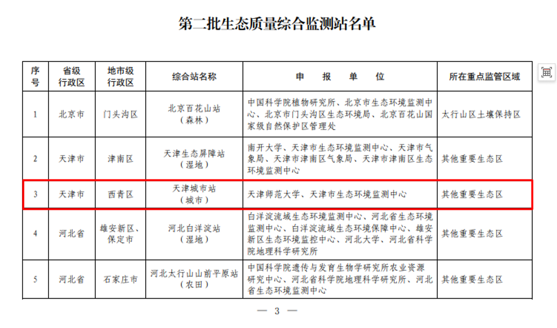 本站訊(通訊員 劉通)2024年12月13日,國家生態環境部發布了《關于印發第二批生態質量綜合監測站名單的通知》,天津師范大學聯合天津市生態環境監測中心成功獲批建設國家生態質量綜合監測站(天津城市站(城市))。平臺的獲批彰顯了天津師范大學在生態質量監測領域的科研實力與貢獻,標志著天津市在構建生態質量監測網絡方面邁出了堅實的一步。