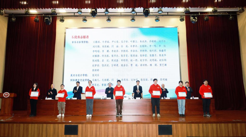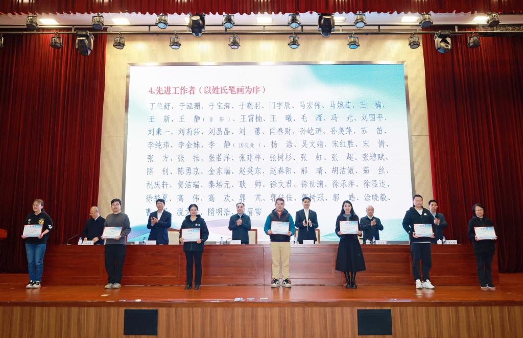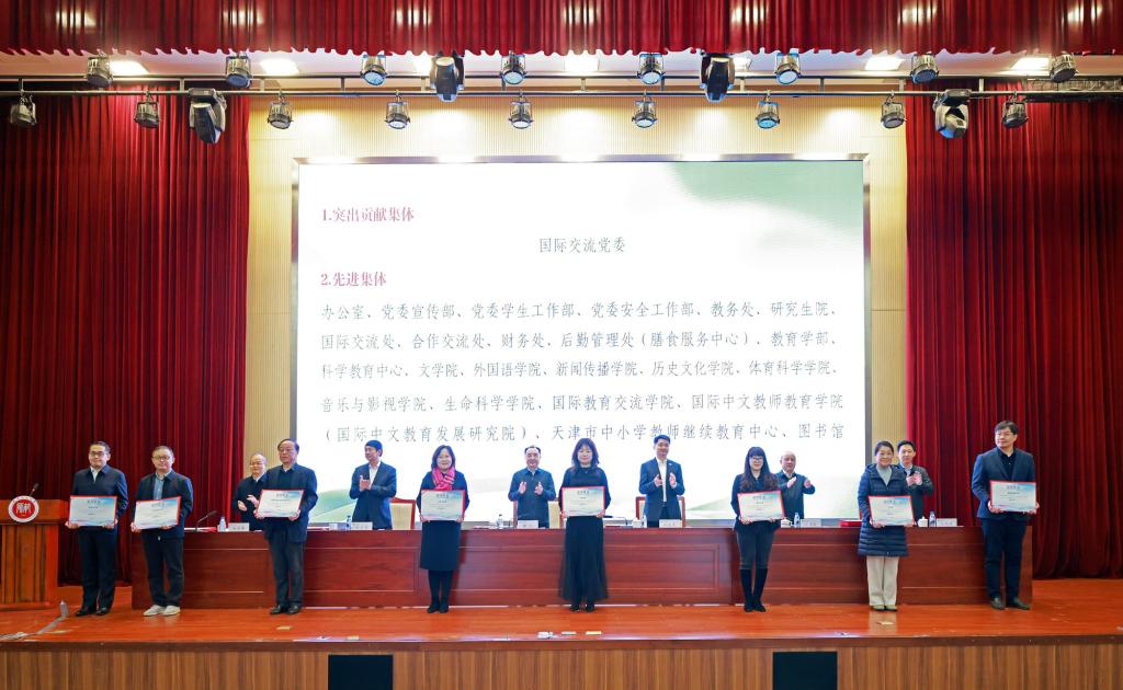 校領導為獲獎集體和個人頒獎。與會人員共同觀看“漢語橋”回顧片。國際教育交流學院、國際交流處、國際中文教師教育學院(國際中文教育發展研究院)、后勤管理處、黨委安全工作部相關負責同志以及志愿者代表作交流發言。我校機關各部、處(室)、直屬單位、各學部(院)師生代表,受表彰人員參加會議。