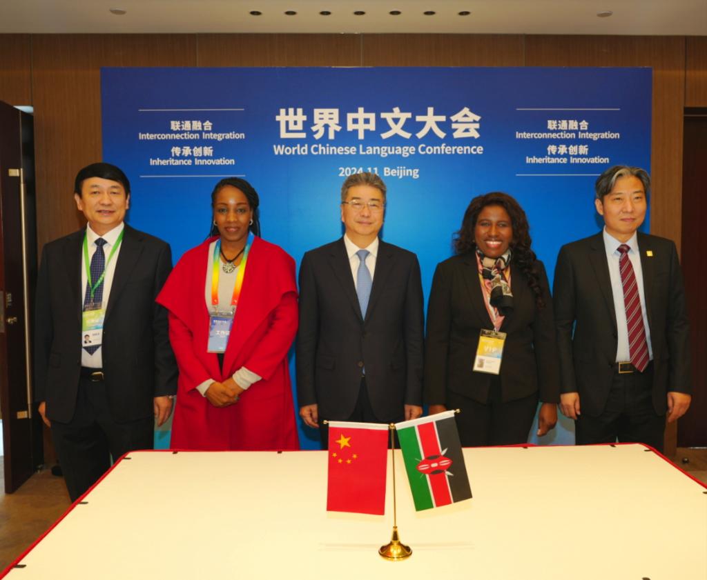 16日上午,大會專門舉行兩國教育部在肯尼亞合作開展中文教育的諒解備忘錄簽署儀式,中國教育部副部長吳巖與肯尼亞教育部副部長碧翠絲·穆甘達·楊加拉共同簽署部際合作協議。郁云峰、鐘英華等參加簽署儀式。協議簽署進一步推動助力肯尼亞中文納入國民教育體系實施落地,促進兩國國際中文教學研究、本土師資聯合培養、合作教材編寫、合作科學研究、文明交流互鑒等,協議由內羅畢大學與天津師范大學共同合作組織落實,加強聯通協同,加快推動實施。