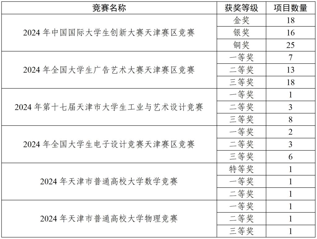 本站訊(通訊員 李倩 周藝璇)近日,天津市教委公布了2024年天津賽區學科競賽的賽事獲獎名單,我校在2024年中國國際大學生創新大賽天津賽區競賽、2024年全國大學生廣告藝術大賽天津賽區競賽等多項賽事中累計獲獎126項。