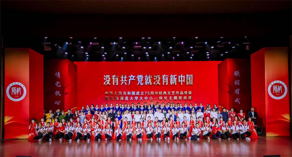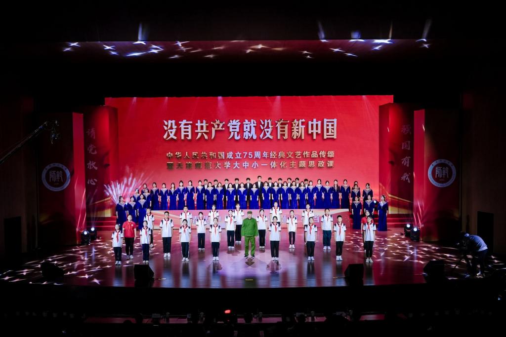 黨委宣傳部 校團委消息 為貫徹落實習近平總書記在全國教育大會上的重要講話精神,號召青年學子“心懷國之大者”,用實際行動踐行“請黨放心、強國有我”的錚錚誓言,9月29日晚,我校在國際教育交流活動中心舉辦“沒有共產黨就沒有新中國”中華人民共和國成立75周年經典文藝作品傳頌暨天津師范大學大中小一體化主題思政課。校黨委書記曲凱、黨委副書記陳泮成,天津市紀委監委駐天津師范大學紀檢監察組組長徐興云,黨委常委、副校長白學軍、陳玳瑋出席。