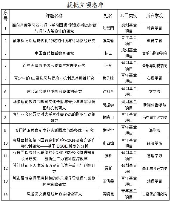 社會(huì)科學(xué)處消息(通訊員 宋昊澤)近日,教育部社會(huì)科學(xué)司公布了2024年度教育部人文社會(huì)科學(xué)研究一般項(xiàng)目立項(xiàng)名單,我校共獲批14項(xiàng),其中規(guī)劃基金項(xiàng)目7項(xiàng),青年項(xiàng)目7項(xiàng),申報(bào)項(xiàng)目綜合立項(xiàng)率達(dá)14.7%,同比增長(zhǎng)180%,在全國(guó)高校排名第50位,在全國(guó)師范類(lèi)院校排名第14位,在天津市排名第2,位列市屬高校第一。