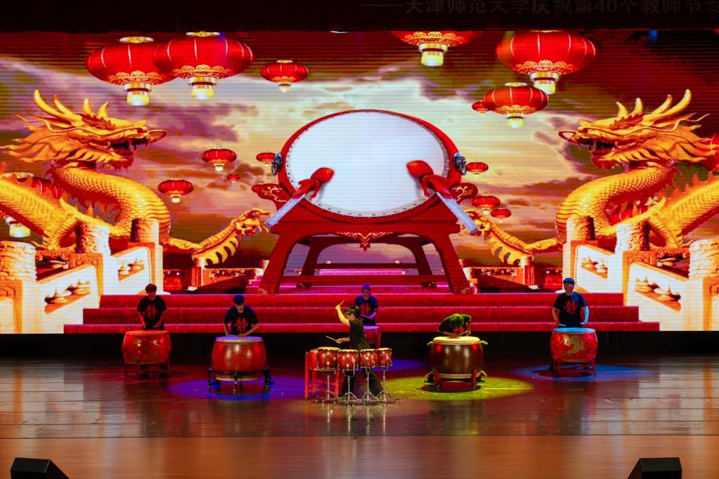 激昂振奮的鼓樂響起,中國大鼓及排鼓音色和節奏拉開了氣勢歡騰的晚會大幕。“因為我們是一家人,相親相愛的一家人,有福就該同享,有難必然同當…… ”,歌舞《相親相愛一家人》給全場帶來了家一般的溫暖,師生同心同力共慶教師節。