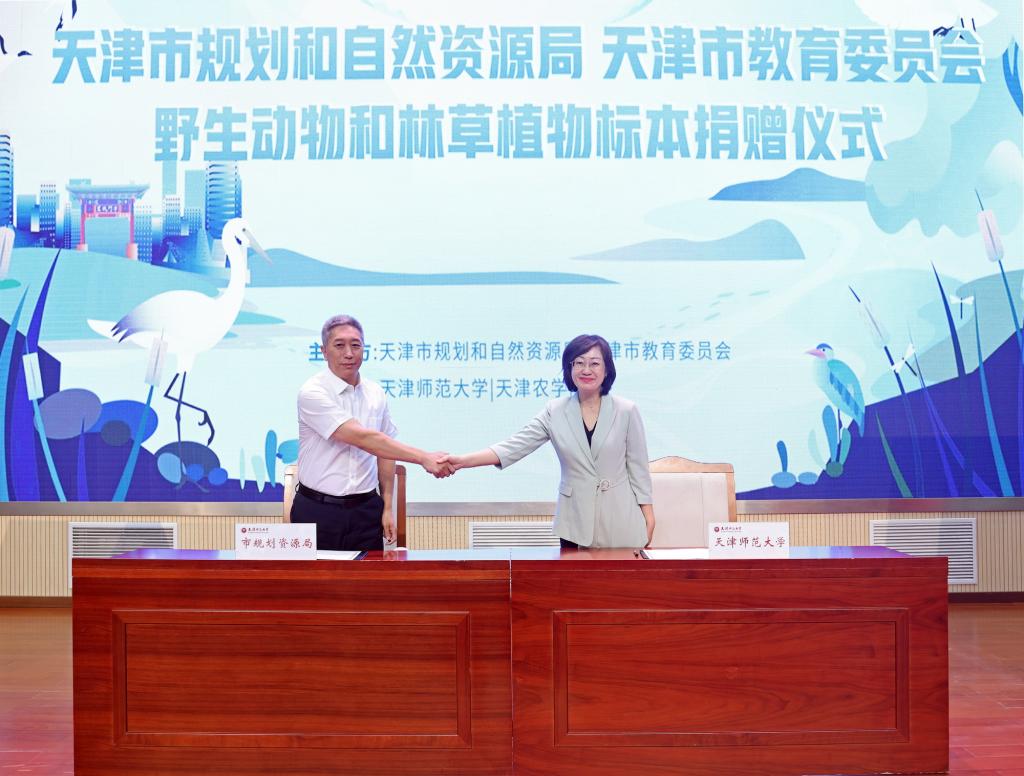 會上,天津市規劃和自然資源局分別向我校移交野生動物標本60件、向天津農學院移交林草植物標本2345件,并現場簽訂捐贈協議。此次捐贈學校的60件野生動物標本,包括國家一級保護動物標本7件、國家二級保護動物標本28件、“三有”保護動物標本21件、其他動物標本4件,種類豐富、栩栩如生,均為近年來社會救助接收和執法部門罰沒移交的野生動物死體制作而成,這些標本已陳列在我校生態記憶館展廳。