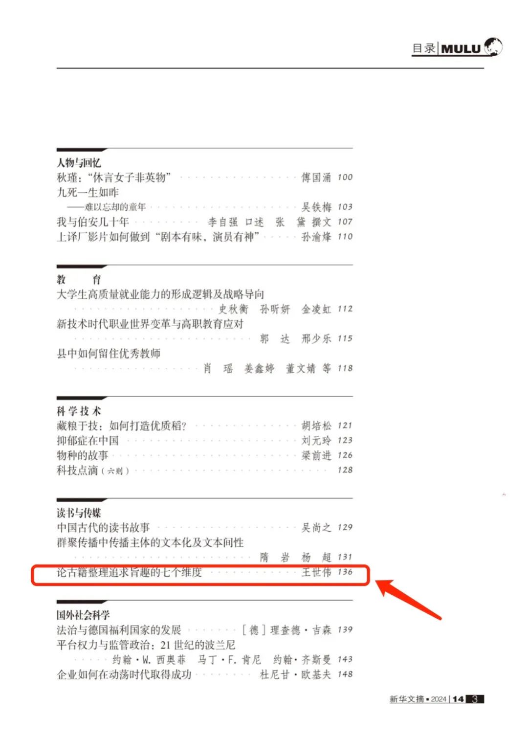 期刊出版中心消息(通訊員 張程)近日,我校學報《天津師范大學學報(社會科學版)》2024年第3期文章《論古籍整理追求旨趣的七個緯度》(作者:王世偉)被《新華文摘》2024年第14期全文轉載。這不僅彰顯了我校學報在社會科學綜合刊物領域深厚的辦刊底蘊和顯著的辦刊成果,也進一步提升了我校學報的學術影響力和學界認可度。