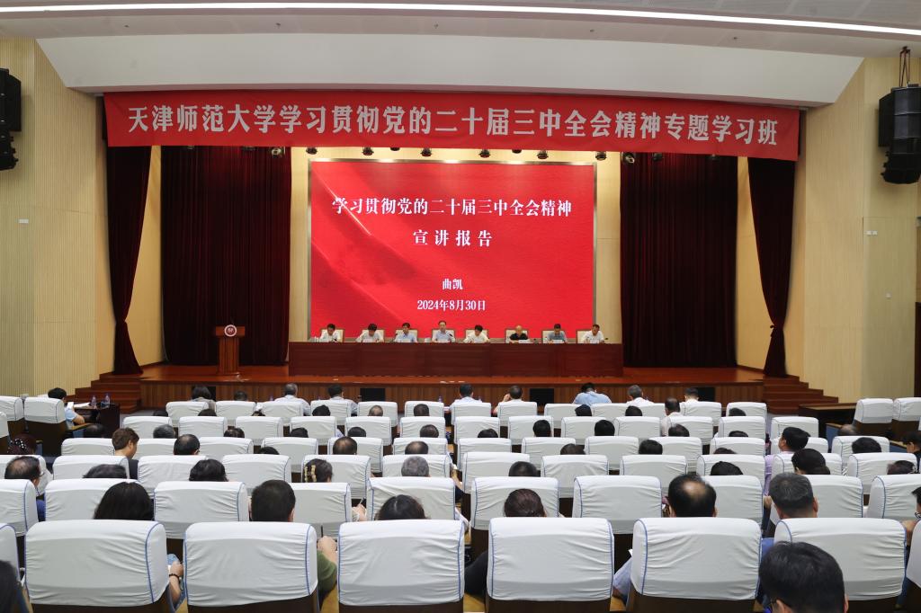 黨委宣傳部消息 8月30日下午,在天津師大學(xué)習(xí)貫徹黨的二十屆三中全會(huì)精神專題學(xué)習(xí)班上,校黨委書記曲凱圍繞學(xué)習(xí)貫徹黨的二十屆三中全會(huì)精神開展專題宣講,對(duì)全校上下進(jìn)一步凝聚共識(shí)、堅(jiān)定信心,搶抓機(jī)遇、開拓進(jìn)取,全力貫徹落實(shí)全會(huì)精神提出要求。校領(lǐng)導(dǎo)班子成員出席,全校處級(jí)及以上領(lǐng)導(dǎo)干部和黨支部書記參加學(xué)習(xí)。會(huì)議由校黨委副書記陳泮成主持。
