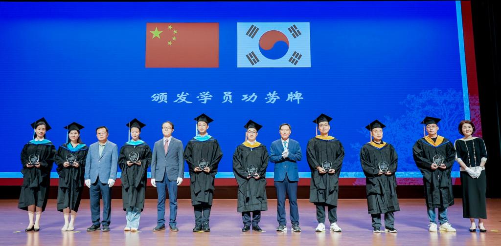 楊薇作本屆中韓合作辦學項目碩士研究生培養過程報告。中韓雙方相關部門負責人向雙方教學和管理人員、優秀學員等頒發優秀論文證書和優秀學員證書。