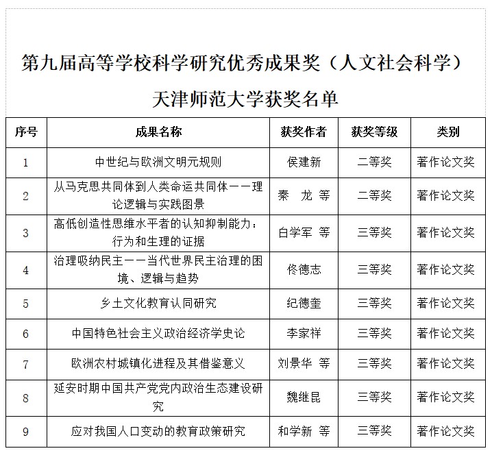 社會科學處消息(通訊員 宋昊澤)近日,第九屆高等學校科學研究優秀成果獎(人文社會科學)評選結果正式公布,我校共有9項成果獲獎,獲獎數量再創歷史新高,比第八屆增長28.6%,位列天津市第二、市屬高校第一。