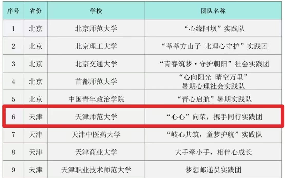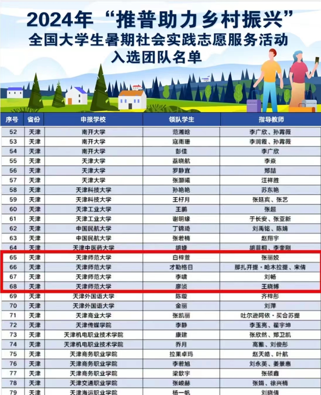 教育部語言文字應(yīng)用管理司、共青團(tuán)中央青年發(fā)展部組織開展的2024年“推普助力鄉(xiāng)村振興”全國大學(xué)生暑期社會實(shí)踐志愿服務(wù)活動,共有1452所高校的6998支團(tuán)隊參與申報,經(jīng)專家審議,天津市共有28支團(tuán)隊入選,其中我校有4支團(tuán)隊成功入選。