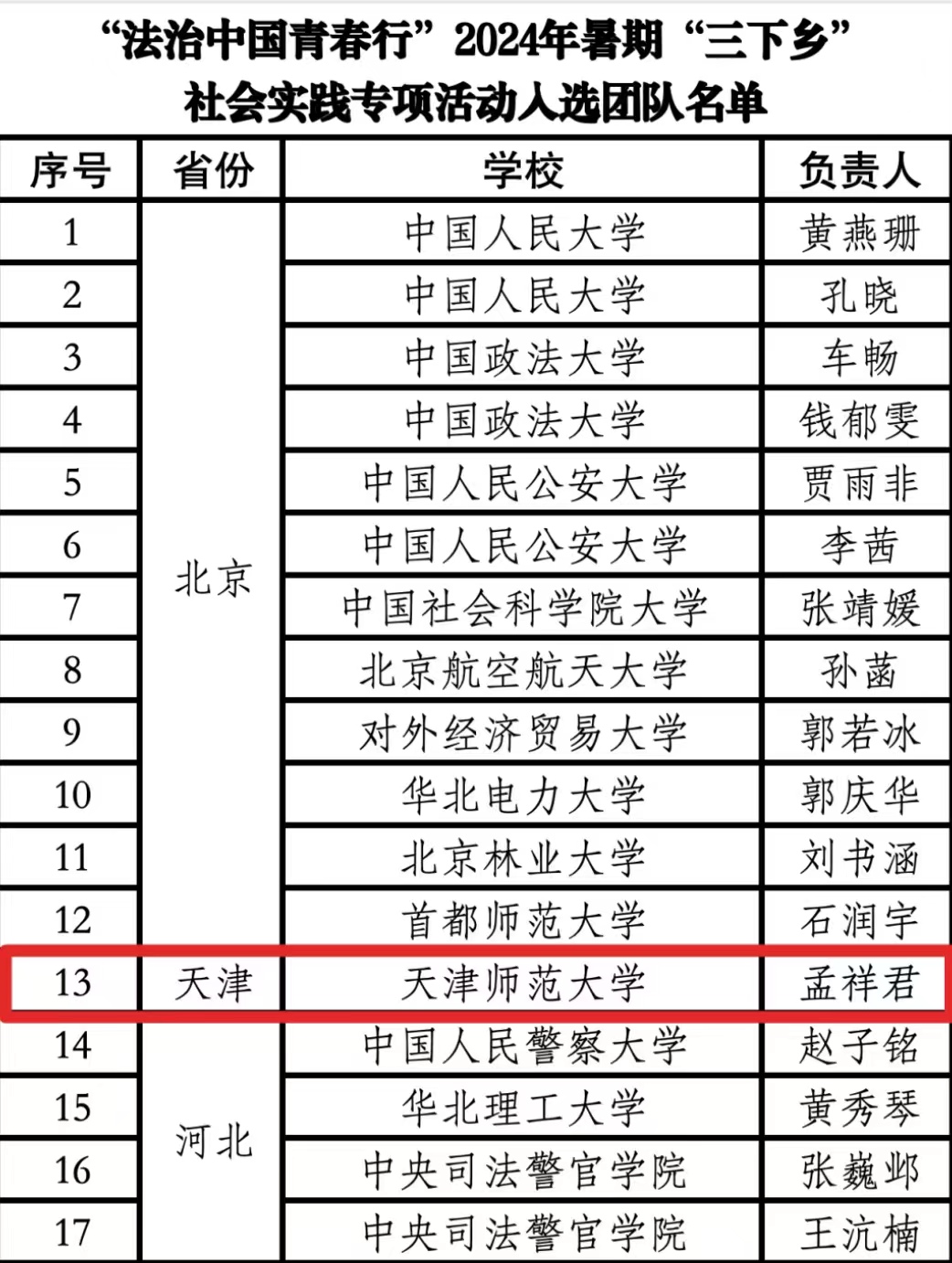 共青團(tuán)中央維護(hù)青少年權(quán)益部、司法部普法與依法治理局、公安部禁毒局聯(lián)合指導(dǎo)開展“法治中國青春行”2024年全國大學(xué)生“三下鄉(xiāng)”暑期社會實(shí)踐專項活動。全國共2204支團(tuán)隊報名參加,經(jīng)過認(rèn)真評審,遴選出108支團(tuán)隊。其中,我校1支隊伍成為天津市唯一入選團(tuán)隊。
