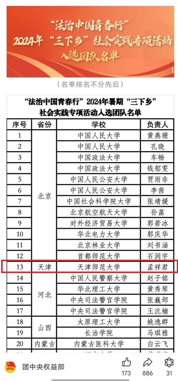 教育學部消息(通訊員 王立冬 張麗姣)近日,共青團中央維護青少年權益部、司法部普法與依法治理局、公安部禁毒局聯合指導開展“法治中國青春行”2024年全國大學生“三下鄉”暑期社會實踐專項活動。來自全國的2204支團隊報名參加,經專家審議遴選出108支團隊,我校教育學部“津法育童心”基層普法團作為天津地區唯一一支團隊入選。