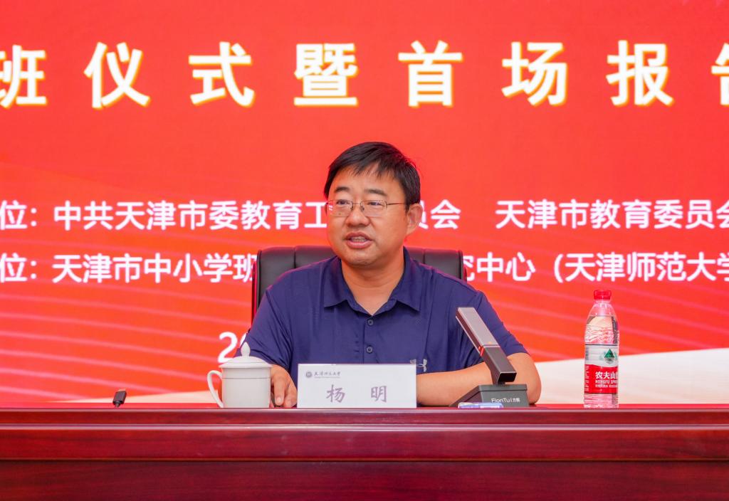 楊明指出,天津市骨干德育干部高級研修班是提升德育骨干教師隊伍質量的重要培訓,全體參訓人員要提高政治站位,認真參訓,切實提升德育工作能力本領。首場報告會上,楊明以深刻認識當前意識形態領域的總體形勢所面臨的風險挑戰,深刻思考教育強國戰略目標與鞏固馬克思主義意識形態主陣地的關系為切入,結合大中小學思想政治教育、日常管理、網絡思政、心理健康教育中的真實工作案例,旁征博引,深入分析講解,指導廣大教師深刻思考在中國式現代化的征程中,堅持不懈用習近平新時代中國特色社會主義思想鑄魂育人的艱巨責任和光榮使命。他強調,參訓德育骨干要增強政治意識,全面貫徹黨的教育方針,堅守“為黨育人、為國育才”的初心使命,帶好工作隊伍,做好育人工作,努力培養德智體美勞全面發展的社會主義建設者和接班人。