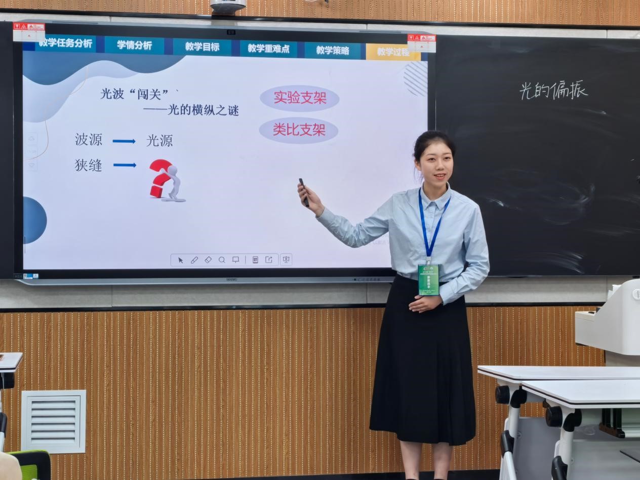 活動中,施芷妍結合可視光路加光傳感器,形象展示了光的偏振現象;林慧玲以最新的方式呈現最舊的實驗,打造極富趣味的電磁“明星”實驗;高可瑩以項目式教學的理念展示了反沖的物理實質;陳雨馨制作FAST天眼模擬演示儀講述光的反射原理;劉蕊利用信息化與教學相融合展示了液體壓強的特點及應用。