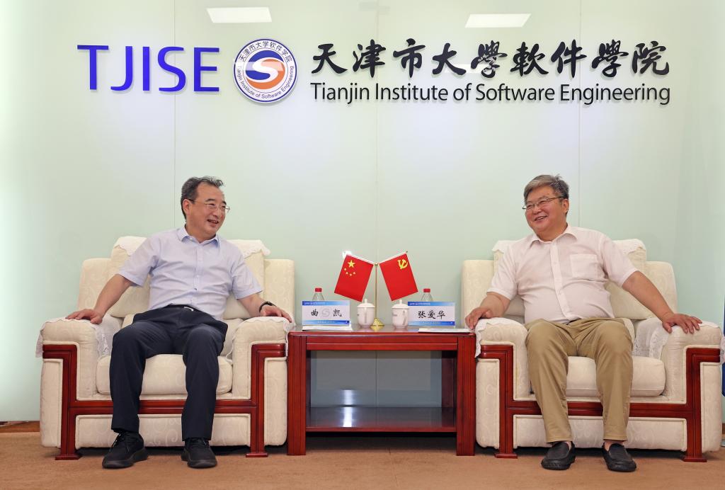 張愛華對曲凱一行到訪天津市大學軟件學院表示熱烈歡迎。他詳細介紹天津市大學軟件學院發(fā)展歷程、辦學特色、人才培養(yǎng)模式等情況后表示,天軟始終以軟件產(chǎn)業(yè)發(fā)展、行業(yè)人才需求為導(dǎo)向,多年來走出了一條政產(chǎn)學研用協(xié)同培養(yǎng)軟件人才的新路,在創(chuàng)新創(chuàng)業(yè)教育、引企入校引企入教方面積累了豐富的實踐經(jīng)驗。希望充分發(fā)揮天軟“多企業(yè)、多高校、多層次”互動融合軟件人才培養(yǎng)機制優(yōu)勢,與天津師范大學加強合作,共同努力,為培養(yǎng)信創(chuàng)產(chǎn)業(yè)急需人才作出更大貢獻。
