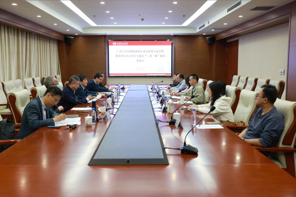 田利輝對進一步加強兩校人文社會科學(xué)交流,并圍繞國家重大戰(zhàn)略開展深度合作表示支持。座談會上田利輝介紹了廣西大學(xué)繁榮哲學(xué)社會科學(xué)和服務(wù)“一帶一路”建設(shè)的經(jīng)驗與做法,我校相關(guān)職能部門負責同志、教師代表分別從學(xué)科建設(shè)、國際交流、科學(xué)研究等方面對學(xué)校工作進行了介紹。