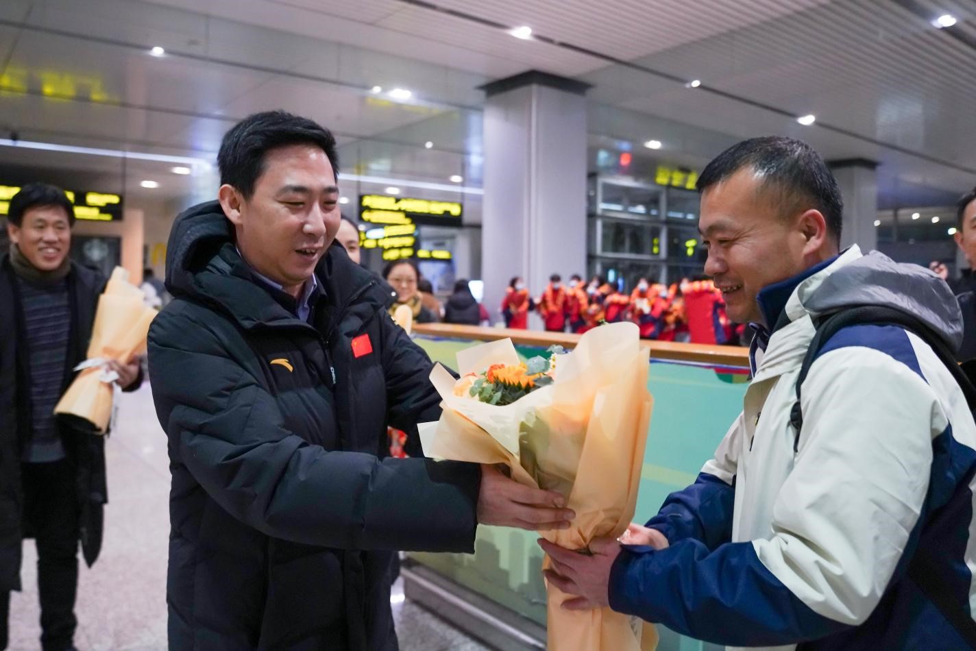 “祝賀大家圓滿完成實習支教任務,我們代表全校師生接你們回家啦!”在機場出站口,副校長陳玳瑋與隨行人員一起向支教團帶隊教師送上鮮花、為同學們送上龍年紀念玩偶和慰問包,并與大家親切交流。他首先代表學校對援疆支教師生的辛勤付出表示感謝和敬意,對師生圓滿完成本次支教任務順利返校表示祝賀和歡迎,對同學們用實際行動為邊疆教育和社會發展所做的貢獻表示贊賞。他說,支教團的行動牽動著全校師生的心,我們無時無刻不在惦念和關心著支教師生,同學們是新時代好青年,是師大的驕傲,“一次援疆行、終身援疆情,一次支教行、一生支教情”,援疆支教這段特殊的經歷,是同學們一生難忘的財富,不僅錘煉本領、增長才干、結交友誼,還以實際行動展示了師大學子的挺膺擔當。希望同學們將此次難忘的青春歷練和寶貴的精神財富傳承下去,賡續奮斗、勇毅前行,為黨和國家的教育事業貢獻青春力量。