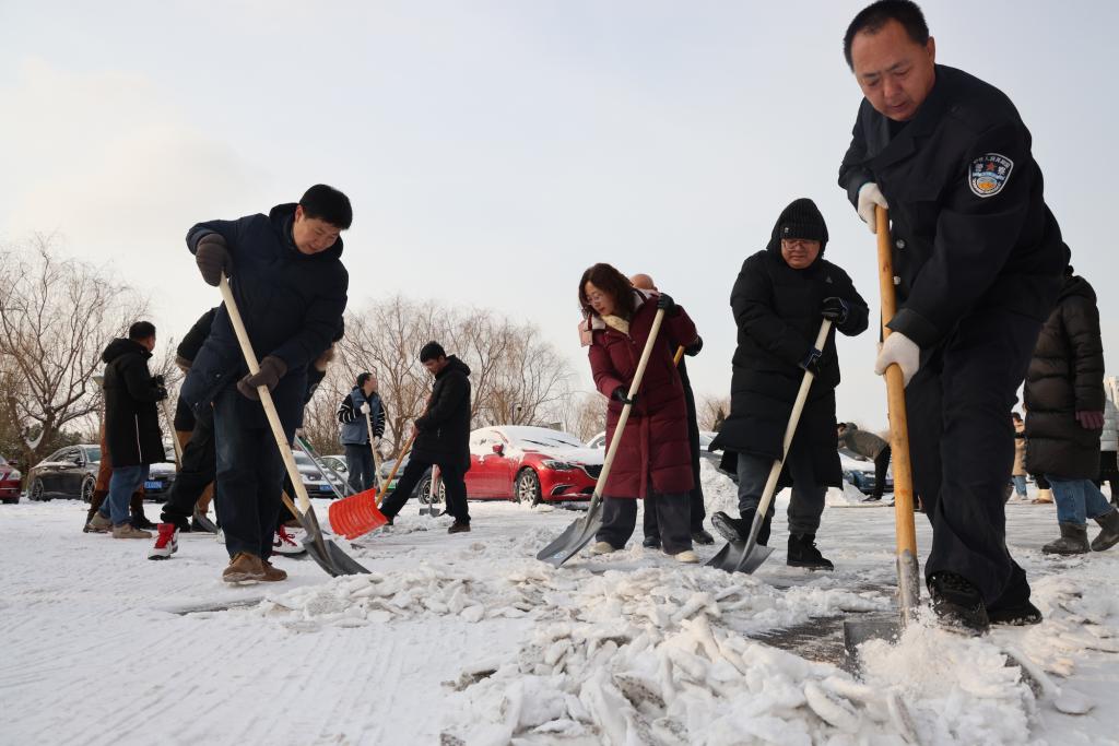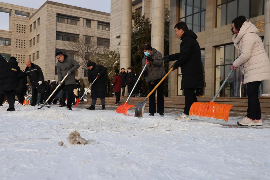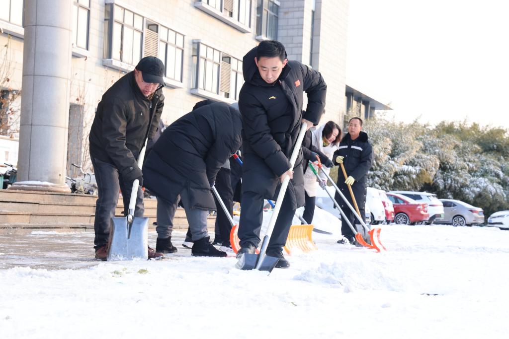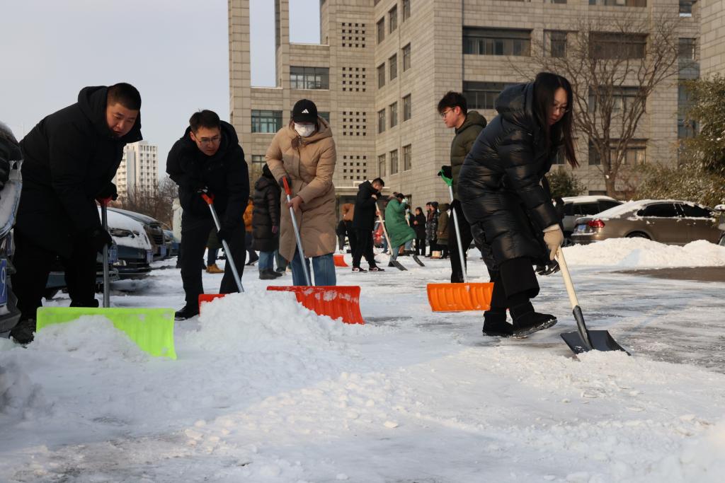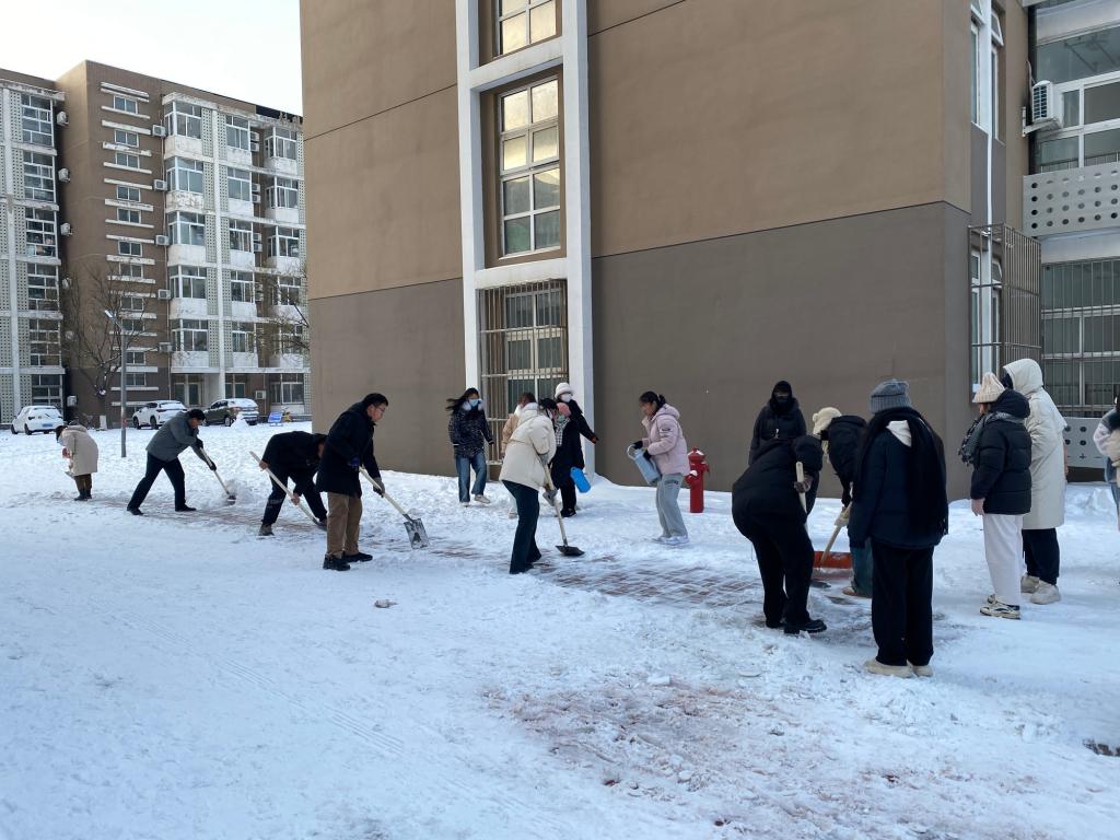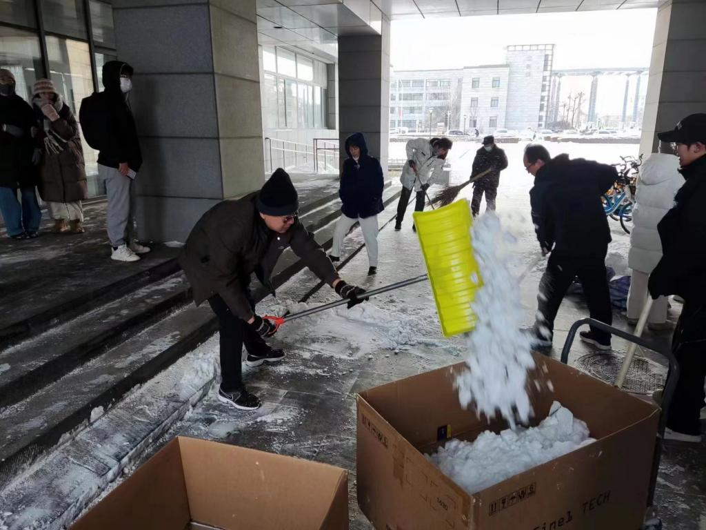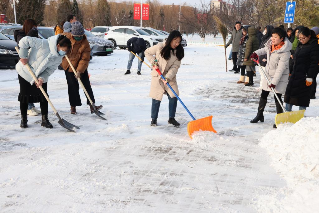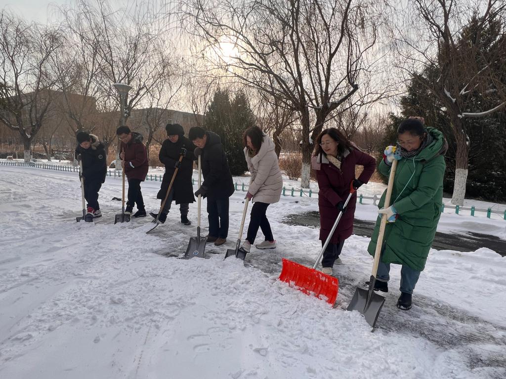 除雪現場,師生們化身校園“守護者”,紛紛行動起來,不怕苦不怕累,大家團結協作、互幫互助,手持推雪鏟、鐵鍬等工具,有序地清理道路積雪、鏟除路面結冰。師生們熱火朝天地忙碌著,用火熱的情懷為冬日校園增添了一股暖流,為全校師生的安全出行提供了保障。