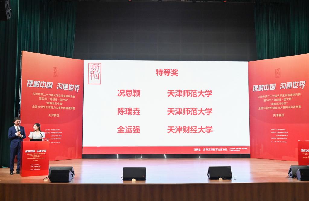 外國語學院消息(通訊員 陳乾坤)近日,由天津市教委主辦、天津大學外國語學院承辦的2023“外研社·國才杯”“理解當代中國”全國大學生外語能力大賽落下帷幕。我校外國語學院學生況思穎、陳瑞垚在演講決賽中表現出色,分別獲得特等獎第一名和第二名,創造了我校在該項賽事中的最佳成績。來自外國語學院的喻可心、況思穎、蕭海棠、董鈺姍、劉嘉文、陳瑞垚等六位同學將代表天津市參加四個賽項的全國總決賽。