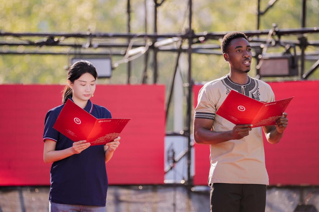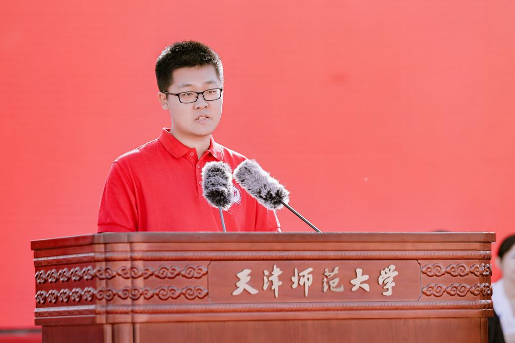 “立鴻鵠志,做奮斗者,賡續師范榮光!”的青春宣言響徹全場。在《筑夢天師 津彩啟航》的歡迎辭中,博士研究生國家獎學金獲得者、心理學部2023級博士生高源霞,第二屆全國大學生職業規劃大賽銅獎獲得者、政治與行政學院2023級碩士生扈馨予,上合組織天津峰會、“漢語橋”賽事學生志愿者、外國語學院2022級本科生李增豪,國際教育交流學院2022級本科生凱文(赤道幾內亞籍),以及我校赴邊疆支教、扎根西部從教的2025屆優秀畢業生代表、大學生支教團代表,以“青春奮斗正當時”激情號召全體師大學子大力弘揚教育家精神,傳承師大情懷,涵育師范品格,踐行人生理想,回應時代召喚,勤學篤行、奮發有為、挺膺擔當。