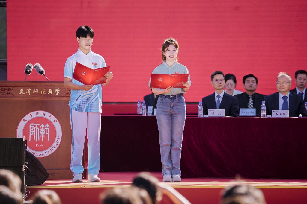 新生代表、化學學院2025級博士研究生徐思遠,教育學部2025級公費師范生王帥在發言中表示,要繼承和弘揚師大精神,珍惜在師范大學的求學時光,以扎實的學識迎接未來挑戰,用行動詮釋新師大人的使命擔當,將青春夢融入中國夢,為強國建設、民族復興偉業貢獻智慧和力量。