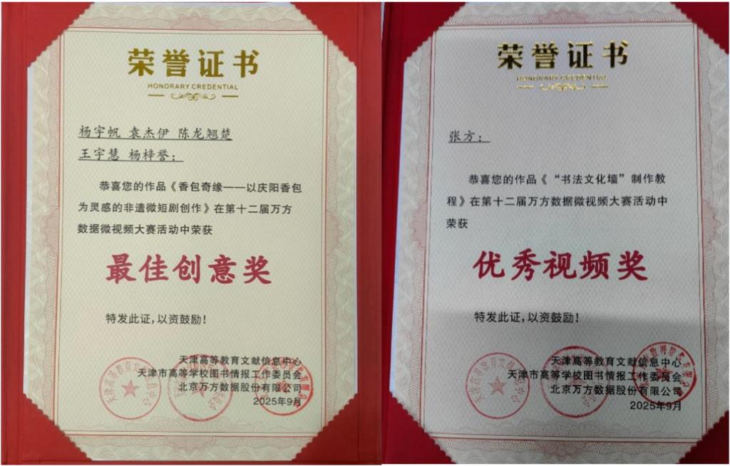 歷史文化學院學生楊宇帆、袁杰伊、陳龍翹楚、王宇慧、楊梓譽創作的作品“香包奇緣——以慶陽香包為靈感的非遺微短劇創作”,以慶陽香包這一國家級非物質文化遺產為創作靈感,通過微短劇的創新形式,結合AI技術,生動展現了非遺文化的歷史底蘊與生機活力,憑借獨特的創意視角和精良的制作,獲得“最佳創意獎”。