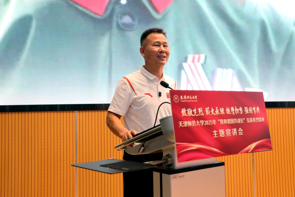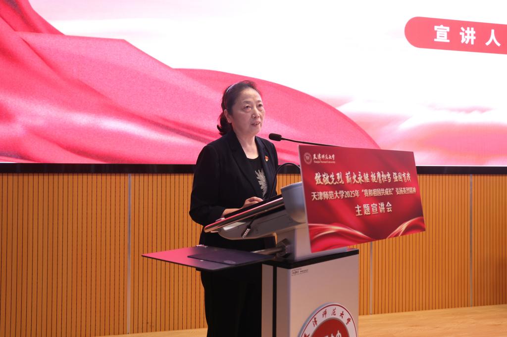 董洪霞代表學(xué)校對(duì)宣講團(tuán)各位英模代表的到來表示熱烈歡迎和衷心感謝。她指出,作為天津百年師范教育的傳承者,天津基礎(chǔ)教育文脈發(fā)祥地,天津師范大學(xué)始終與民族同命運(yùn)、與祖國(guó)共奮進(jìn),秉承“為黨育人、為國(guó)育才”初心,將紅色血脈融入教書育人全過程。她深情寄語全體師大學(xué)子要鑄牢理想信念,做紅色基因的堅(jiān)定傳承者,堅(jiān)定不移聽黨話、跟黨走,在面對(duì)各種思潮沖擊時(shí),能夠保持定力、明辨是非、堅(jiān)守初心,以青春“小我”之進(jìn)服務(wù)祖國(guó)“大我”之強(qiáng);要厚植家國(guó)情懷,做強(qiáng)國(guó)征程的奮勇開拓者,常懷“國(guó)之所需,我之所向”的使命感,在面對(duì)各種困難和挑戰(zhàn)時(shí),要以國(guó)家和民族的利益為重,在科技創(chuàng)新、鄉(xiāng)村振興、綠色發(fā)展、社會(huì)服務(wù)、衛(wèi)國(guó)戍邊等各領(lǐng)域各方面勇?lián)姑灰毦瓦^硬本領(lǐng),做民族復(fù)興的接棒奮斗者,到祖國(guó)和人民最需要的地方發(fā)光發(fā)熱,為中國(guó)式現(xiàn)代化建設(shè)貢獻(xiàn)青春力量!