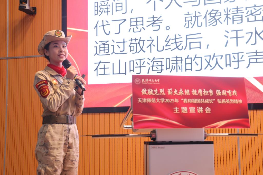 宣講會(huì)邀請(qǐng)弘揚(yáng)英烈精神宣講團(tuán)專家、成員,天津市關(guān)工委德育部部長(zhǎng)、吉鴻昌烈士外孫女鄭吉安,對(duì)越自衛(wèi)反擊戰(zhàn)戰(zhàn)士謝紹云、孫長(zhǎng)亭,“九三閱兵”民兵代表王米佳以親歷者“第一視角”的動(dòng)情講述,再現(xiàn)烽火崢嶸與閱兵盛況,弘揚(yáng)偉大抗戰(zhàn)精神,激揚(yáng)愛國(guó)赤子情懷,為現(xiàn)場(chǎng)師生帶來一堂最厚重、最鮮活、也最震撼人心的“大思政課”。