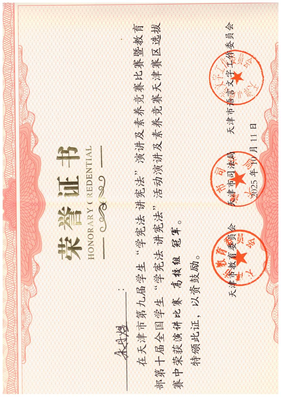本站訊(通訊員 于淼)10月11日,由天津市教育委員會、天津市司法局、天津市語言文字工作委員會聯合主辦的第十屆全國學生學憲法、講憲法演講及素養競賽天津賽區選拔賽圓滿收官。我校政治與行政學院2023級本科生朱丹煜從全市各高校優秀選手中脫穎而出,榮獲高校組冠軍。