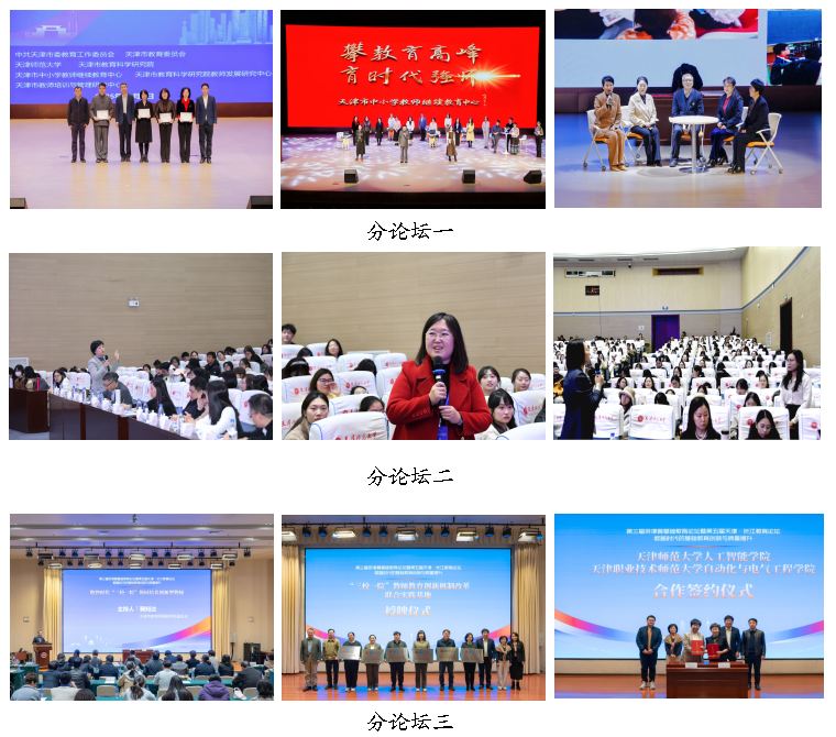 在分論壇環(huán)節(jié),分論壇一以“數(shù)智時(shí)代的基礎(chǔ)教育教師隊(duì)伍建設(shè)”為主題,通過專家報(bào)告、教師教育培訓(xùn)規(guī)劃匯報(bào)、教師培訓(xùn)重點(diǎn)項(xiàng)目結(jié)業(yè)活動(dòng)等形式,展現(xiàn)了師資隊(duì)伍分層分類進(jìn)階式培養(yǎng)取得的顯著成效。分論壇二以“數(shù)智時(shí)代的基礎(chǔ)教育課程教學(xué)變革”為主題,專家報(bào)告精準(zhǔn)回應(yīng)了數(shù)智時(shí)代課程教學(xué)變革的核心關(guān)切,通過理論思辨與實(shí)踐案例的碰撞,為構(gòu)建兼具數(shù)字智慧與人文關(guān)懷的未來教育圖景描繪了清晰的實(shí)踐路徑,為區(qū)域教育協(xié)同發(fā)展提供了學(xué)理支撐。分論壇三以“數(shù)智時(shí)代‘三校一院’協(xié)同培養(yǎng)創(chuàng)新型教師”為主題,開展了專家報(bào)告、天津師范大學(xué)與天津職業(yè)技術(shù)師范大學(xué)相關(guān)學(xué)院簽約儀式、“三校一院”聯(lián)合實(shí)踐基地授牌儀式等活動(dòng),推動(dòng)協(xié)同育人機(jī)制走向?qū)嶓w化、機(jī)制化。