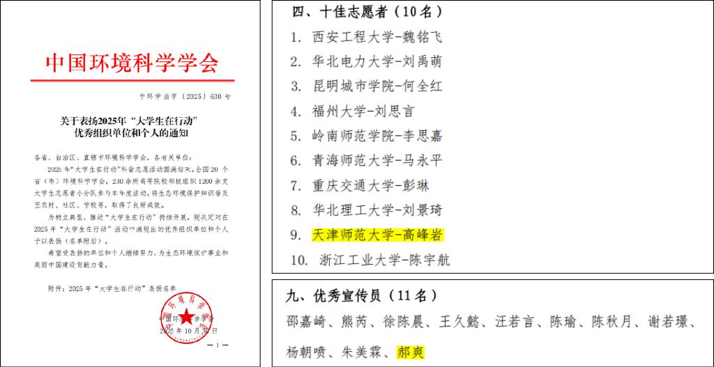 本站訊(通訊員 陳潔)近日,從中國環境科學學會傳來喜訊,在最新發布的《關于表揚2025年“大學生在行動”優秀組織單位和個人的通知》中,我校地理學部師生表現突出,郝爽老師榮獲“優秀宣傳員”稱號,高峰巖同學榮獲“十佳志愿者”稱號。這一榮譽不僅是對兩位師生個人的肯定,更是對學部實踐育人成果的充分認可。