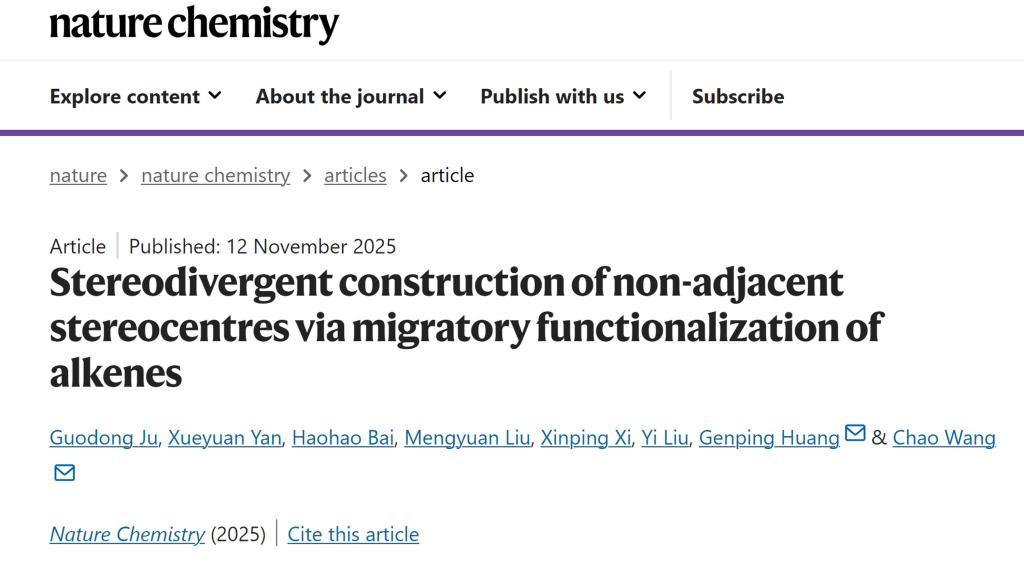 本站訊(通訊員 李小軒)近日,天津師范大學化學學院王超教授團隊與天津大學黃跟平教授合作,在國際頂級期刊Nature Chemistry發(fā)表論文“Stereodivergent construction of nonadjacent stereocenters via migratory functionalization of alkenes”,這是天津師范大學首次以第一通訊單位在Nature大子刊上發(fā)表研究論文。