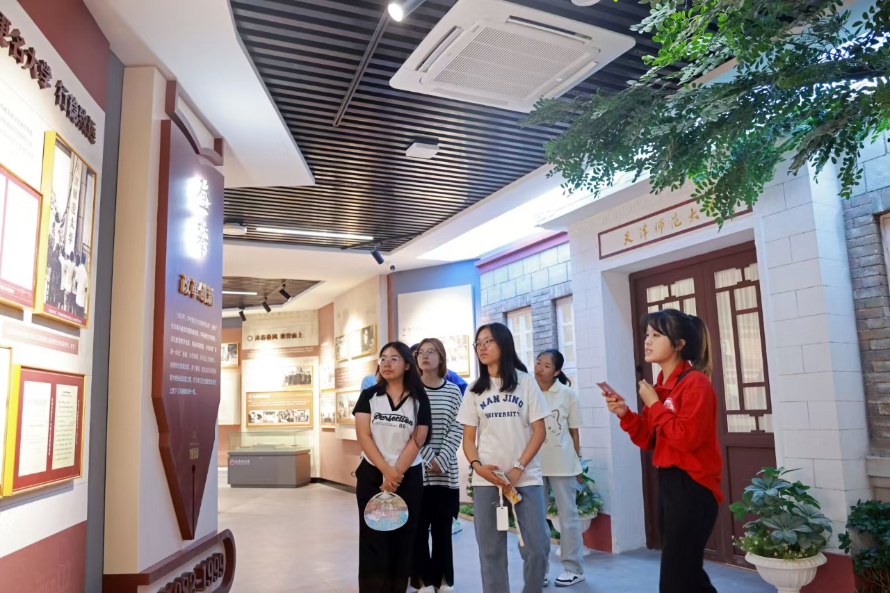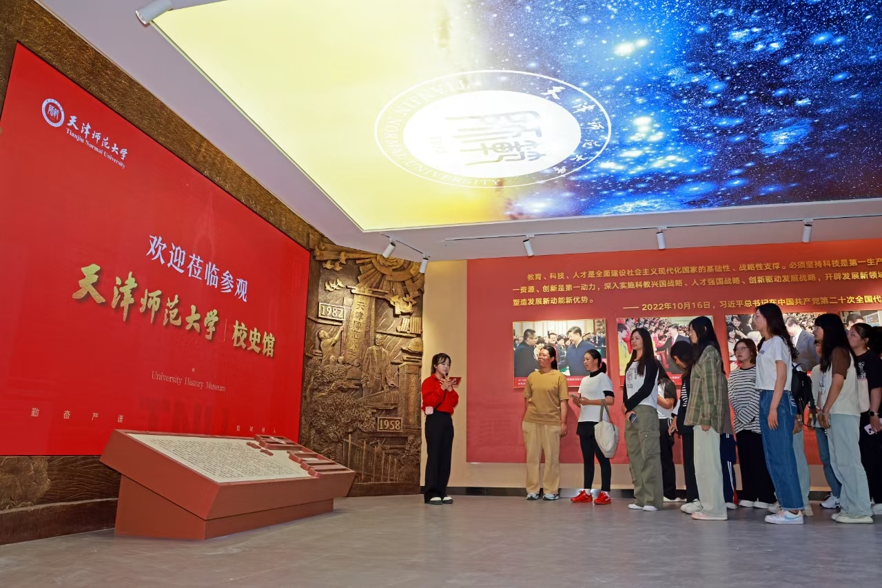 改造后的天津師范大學校史館,汲取天津百年師范教育傳承的典型元素,整體風格樸素典雅。各級領導對我校關懷和指導的難忘瞬間、悠揚的校歌、鏗鏘的校訓、觀瀾溯源的校史發展路線圖、師大八里臺禮堂和90年代老教室的逼真再造、酷炫的創新互動……穿越時間空間,帶領參觀者感受師大人愛國奉獻、追求卓越的壯闊情懷,觸摸師大人執筆書寫“教育強國,師大何為”時代答卷的不懈追求。六秩天津師大的光輝校史,激勵每一位師大人在新的歷史征程上奮勇前行,以更加飽滿的熱情和更加堅定的信念,為中國式現代化貢獻更多的智慧和力量。